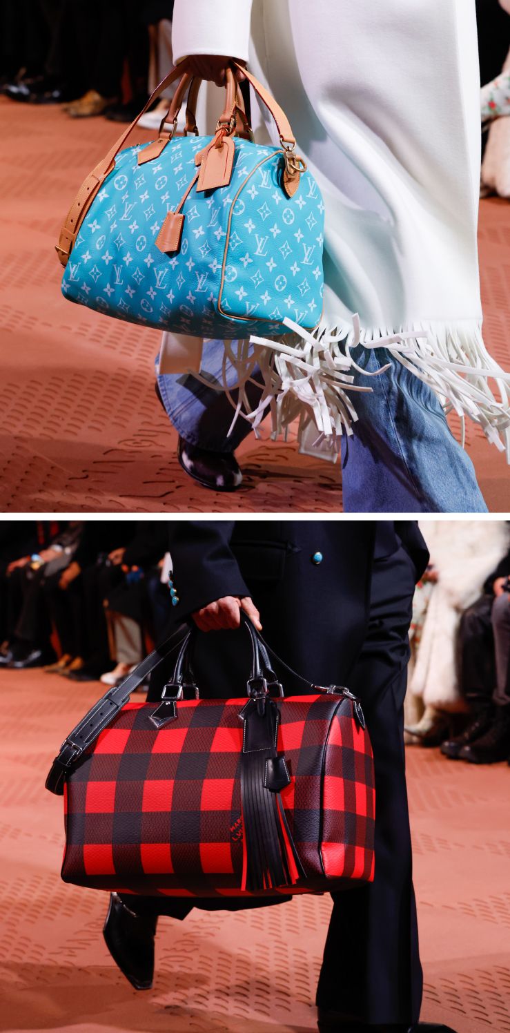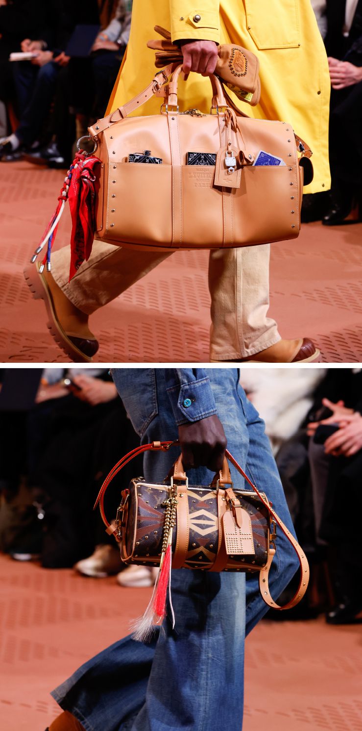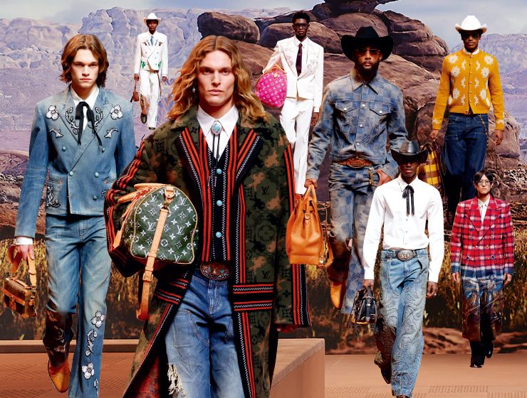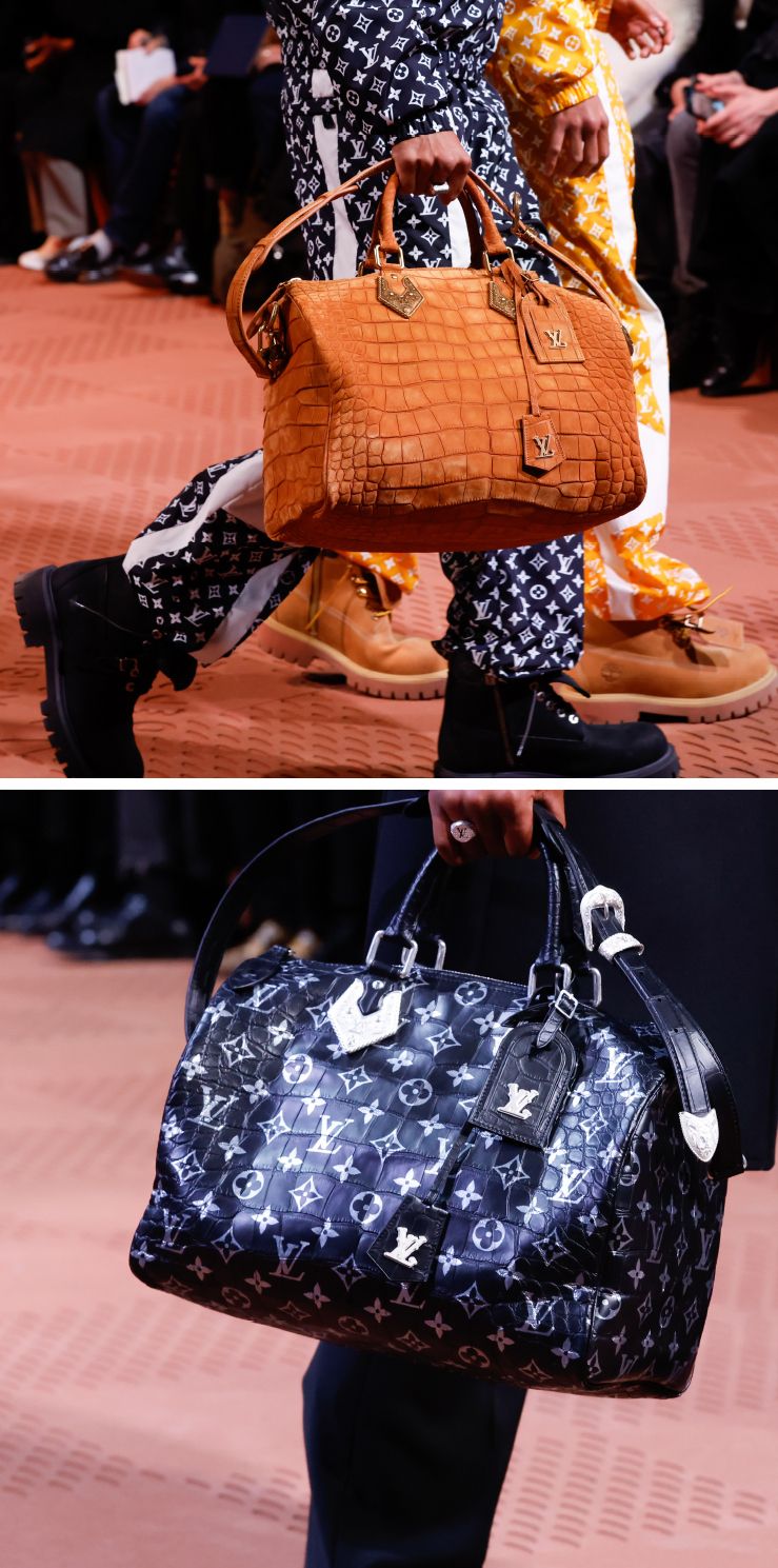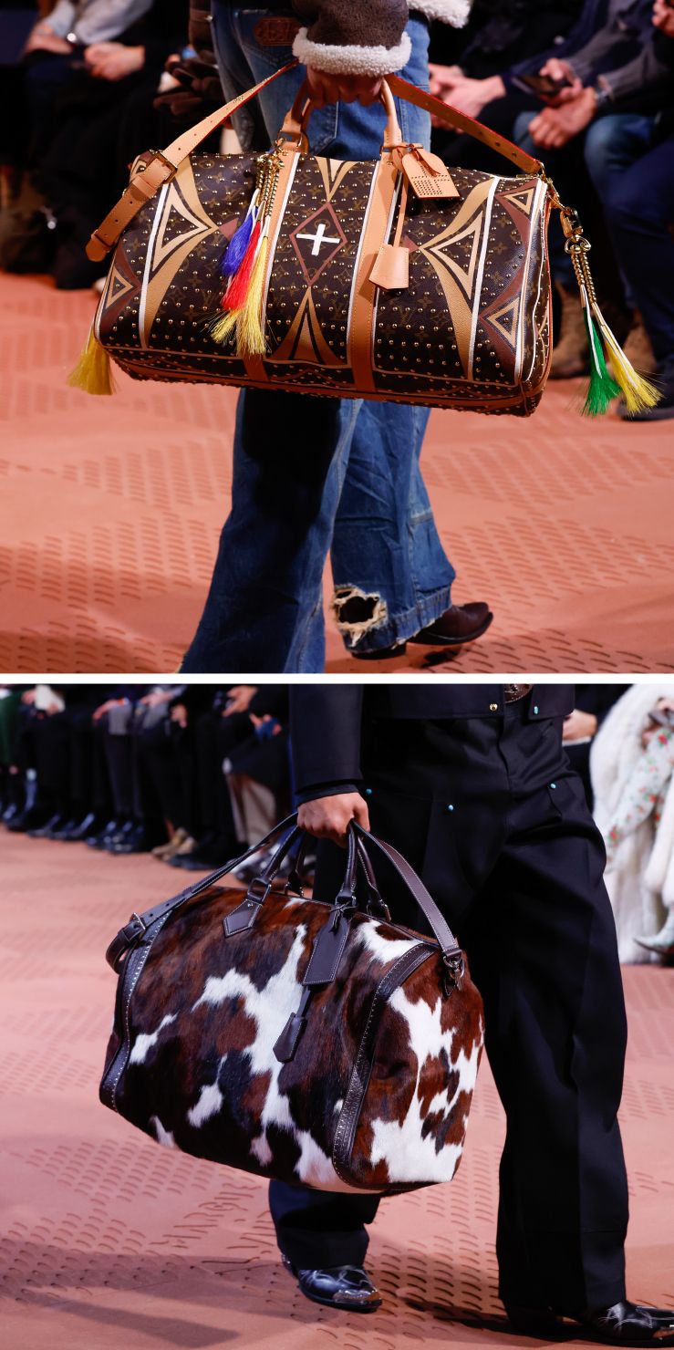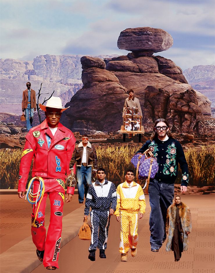 튼튼한 천으로 만든 웨스턴 셔츠, 허리선부터 프린지가 길게 늘어진 레더 챕스, 빛 바랜 데님 덩거리, 그리고 카우보이 해트와 부츠, 버클 벨트, 볼로 타이… 이 클래식한 웨스턴 아이템들을 하이패션의 영역으로 가져다 놓은 건 놀라운 수준의 디테일과 장인정신이었다. 진주와 스팽글, 시퀸, 터키석이 아낌없이 쓰였고, 정교한 자수가 카디건부터 재킷, 데님 셋업, 셔츠, 코트와 가방 위를 가리지 않고 누볐다. 이 모든 작업은 다코타 & 라코타 부족의 장인과 협업한 것이기에 더욱 특별했다. 무엇보다 눈에 들어온 건 가방, 그중에도 다양한 모습으로 변주된 스피디였다. 뽀얀 크림색 모노그램 캔버스 위에 놓인 다코타 플라워 자수와 말갈기를 염색해 만든 키링은 인디언 부족에게, 아일릿과 스터드, 웨스턴 하드웨어는 서부 워드로브에 바치는 루이 비통의 헌사처럼도 보였다. 악어와 타조, 누벅 가죽, 송치는 물론 새롭게 해석된 카무플라주까지 소재 또한 그 어느 때보다 다채로웠다. 쇼는 아메리칸 인디언 출신 파우와우 그룹 보이스 오브 레지스탕스의 연주로 막을 내렸다.