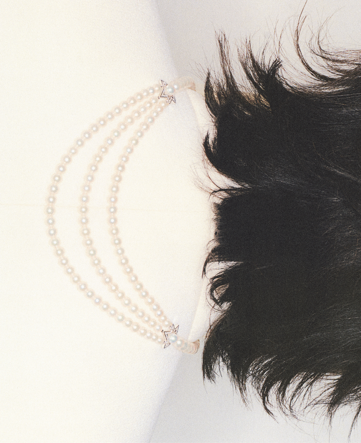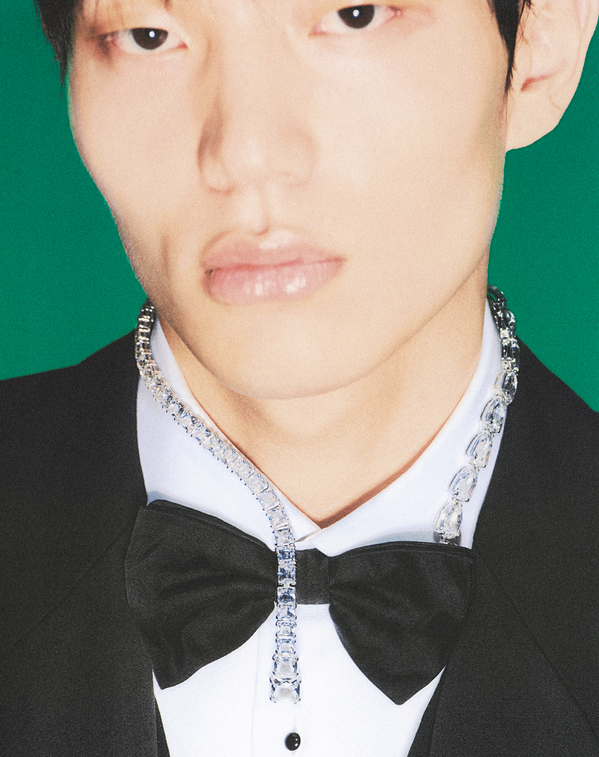 크리스털로 장식한 매트릭스 오픈 네크리스 90만원대 스와로브스키. 재킷 490만원대, 베스트 230만원대, 셔츠 140만원대, 타이 20만원대 모두 돌체앤가바나.