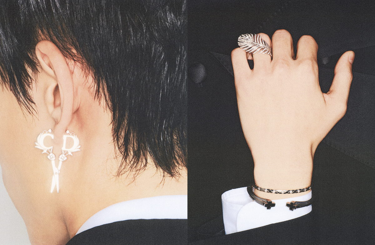 브라스 이어링 가격 미정 디올 맨. 314개의 다이아몬드를 세팅한 화이트 골드 라지 링 7000만원대 부쉐론. 18K 화이트 골드에 브릴리언트 컷 다이아몬드를 세팅한 코코 크러쉬 미니 브레이슬릿 가격 미정 샤넬 화인 주얼리. 실버에 블랙 오닉스를 세팅한 뱅글 가격 미정 스티븐 웹스터. 재킷 490만원대, 셔츠 140만원대 모두 돌체앤가바나.
