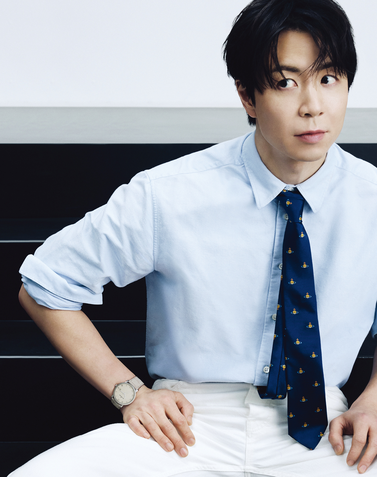 정교하게 폴리싱한 40mm 스틸 케이스와 오팔린 다이얼, 앨리게이터 레더 스트랩으로 세련미를 강조했다. 빌레레 울트라 슬림 1618만원 블랑팡. 셔츠 골든구스. 타이 비비안 웨스트우드. 벨트 수박 빈티지. 팬츠 에디터 소장품.
