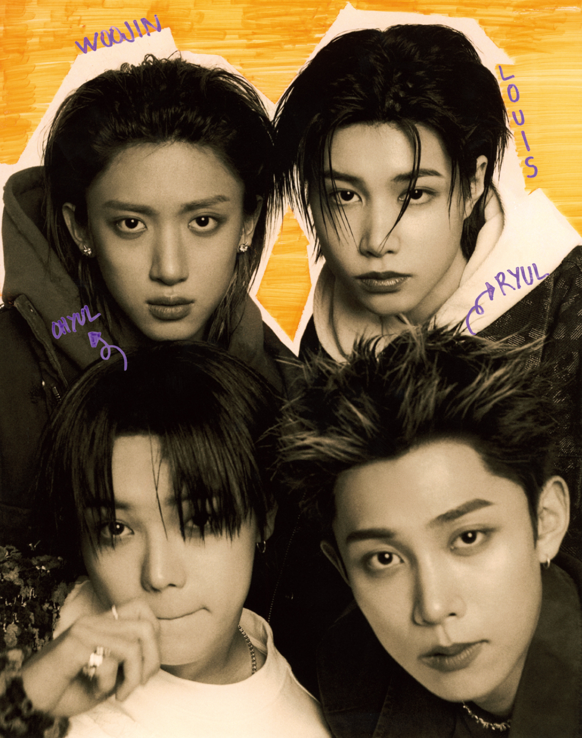 (우진) 재킷 크롬하츠. 톱 커넥트엑스. 팬츠 에모스탠스클럽. 네크리스 크롬하츠. (률) 톱 송지오. 후드 집업, 팬츠 모두 에모스탠스클럽. 슈즈 펜디. 재킷 스타일리스트 소장품. (루이) 톱 존 바바토스. 팬츠, 체인 모두 에모스탠스클럽. 슈즈 펜디. 네크리스 크롬하츠. 글러브 벨루티. 재킷 스타일리스트 소장품. (오율) 재킷, 톱 모두 앙팡 리쉬 데프리메. 팬츠 에모스탠스클럽. 네크리스 크롬하츠.