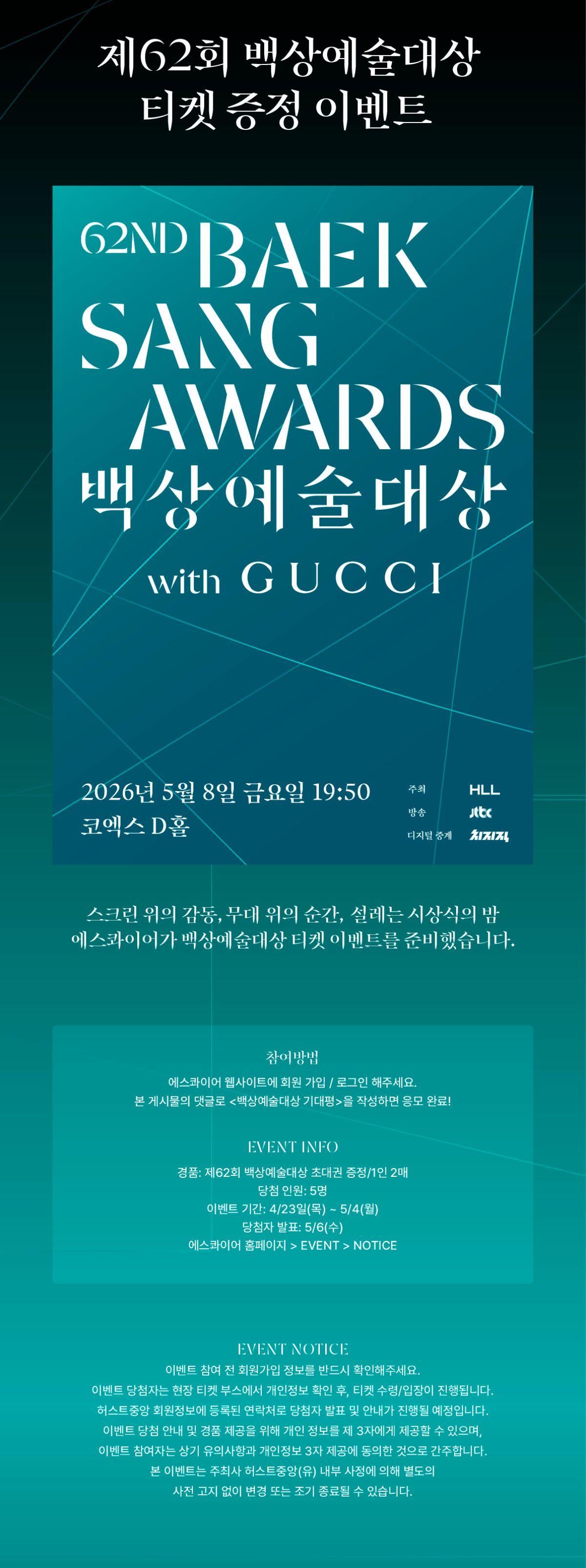 🏆62년의 전통을 지닌 백상예술대상이 한국 뮤지컬 60주년을 맞아 '뮤지컬 부문'을 신설했다는 소식에 가슴이 뛰네요. 방송, 영화, 연극을 넘어 이제는 무대의 감동까지 아우르는 진정한 종합예술 시상식으로 거듭나는 이번 백상의 행보가 정말 기대됩니다. 또한 <왕과 사는 남자>로 전 국민을 울린 박지훈 배우의 생애 한 번뿐인 신인상 도전도 현장에서 꼭 응원하고 싶어요ㅎㅎ 이 역사적인 시상식의 뜨거운 열기를 현장에서 직접 마주할 수 있도록 뽑아주시면 감사하겠습니다🍀✨